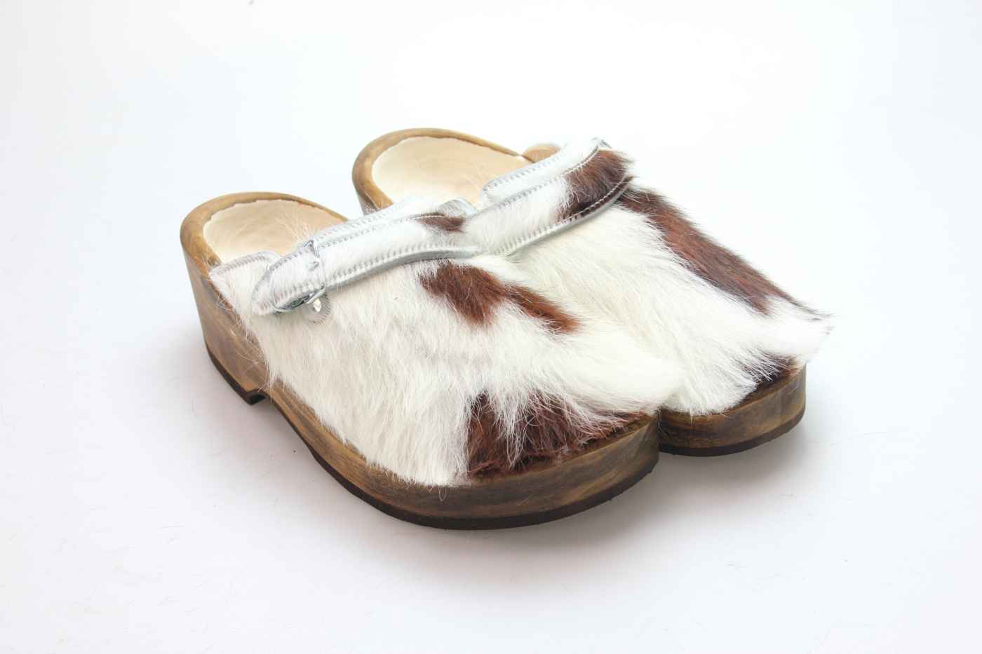 Dieser Holzschuh ist mittels einer Schnalle am Rist/Span verstellbar und ist mit einem Rindsleder gefüttert. Das Obermaterial ist echtes Rindfell. Im Bild sehen Sie das Unikat, welches Sie erhalten.