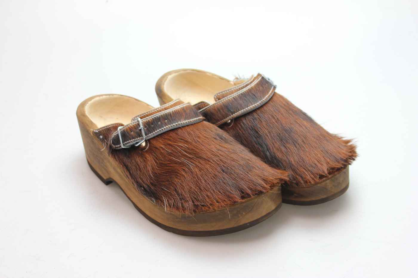 Dieser Holzschuh ist mittels einer Schnalle am Rist/Span verstellbar und ist mit einem Rindsleder gefüttert. Das Obermaterial ist echtes Rindfell. Im Bild sehen Sie das Unikat, welches Sie erhalten.