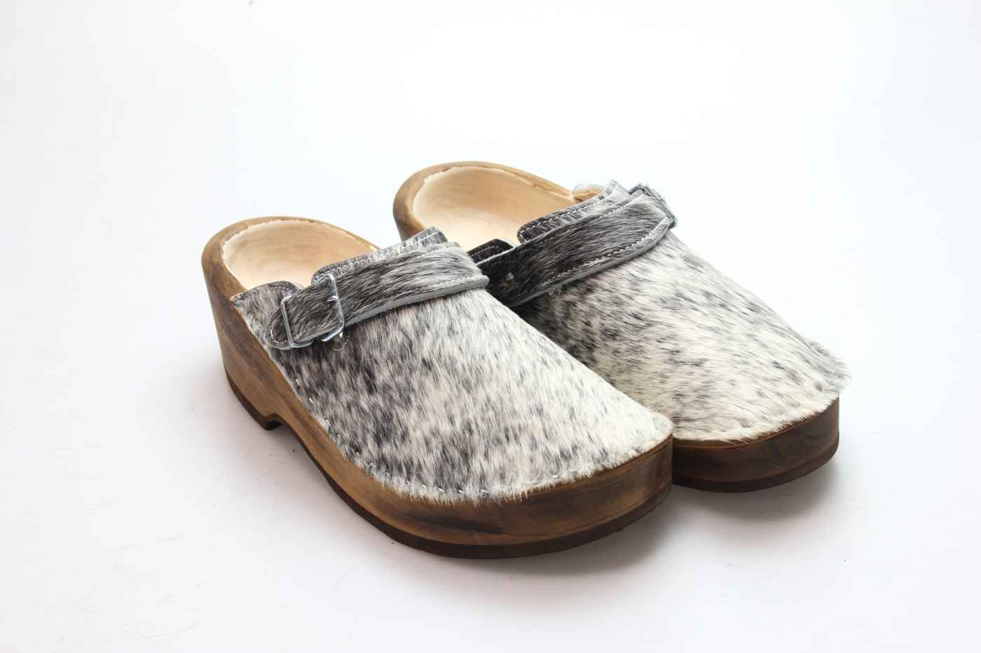 Dieser Holzschuh ist mittels einer Schnalle am Rist/Span verstellbar und ist mit einem Rindsleder gefüttert. Das Obermaterial ist echtes Rindfell. Im Bild sehen Sie das Unikat, welches Sie erhalten.